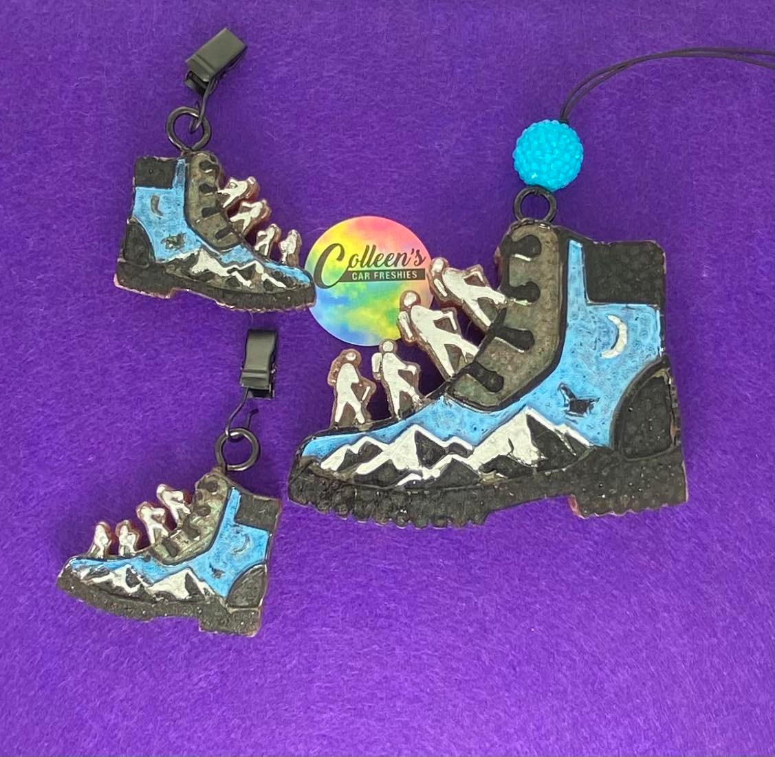 Hiking boot measures approximately 4" x 3.5". Vent clips measure approximately 2"x2"