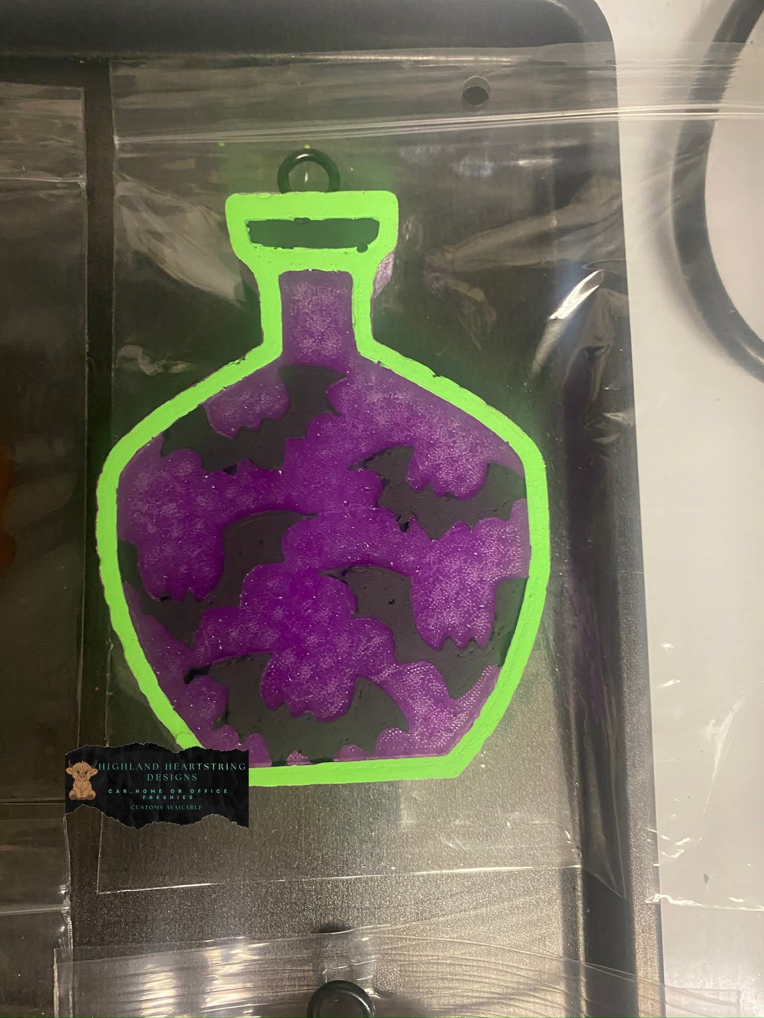 Bats potion bottle measures 3.5"x4.5"